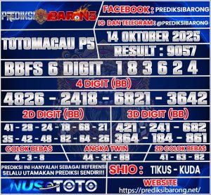 Prediksi Barong adalah layanan prediksi togel yang dirancang khusus untuk membantu para pemain togel dalam meraih keberuntungan. Pada edisi kali ini, kami menyajikan prediksi togel untuk pasar Toto Macau P5 pada hari Selasa 14 Oktober 2025. Dengan analisis mendalam dan metode yang telah teruji, kami berusaha memberikan angka-angka yang memiliki potensi tinggi untuk keluar. Prediksi ini tidak hanya berdasarkan keberuntungan semata, tetapi juga menggunakan data statistik dan pola permainan sebelumnya yang dapat memberikan wawasan lebih bagi para pemain.