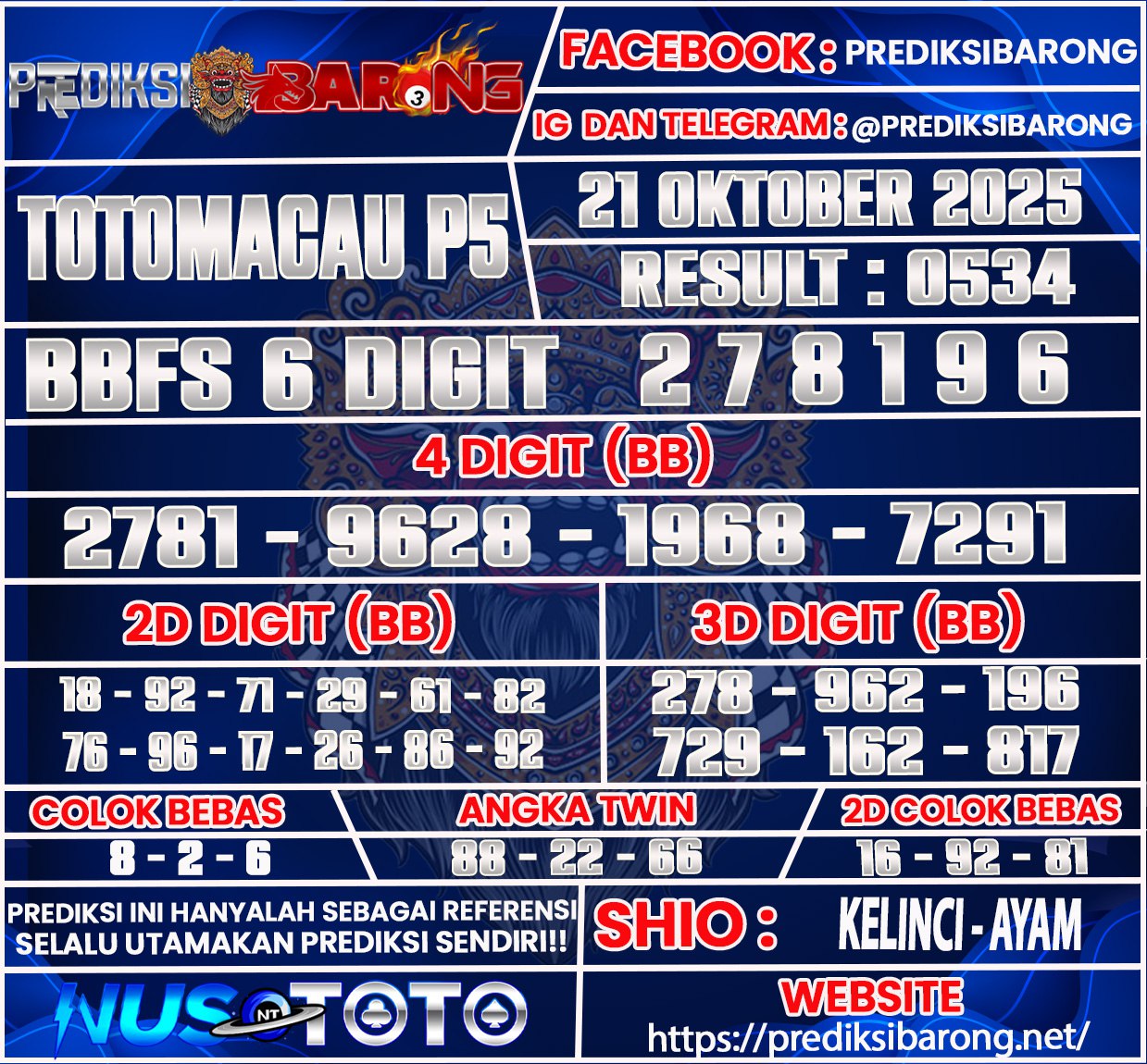 Oleh karena itu tanpa menunggu lama inilah Prediksi Toto Macau P5 Oktober 2025 Selasa tanggal 21 Prediksi Barong :