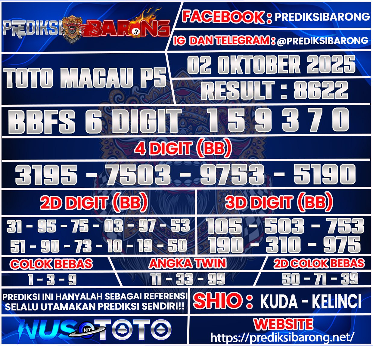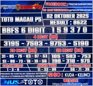 selamat datang di Situs Prediksi Barong. Prediksi Barong merupakan situs prediksi angka togel yang berasal dari situs togel terpercaya dan teramanah yaitu NUSTOTO. Prediksi Barong sendiri sudah berdiri dari tahun 2018 hingga sekarang dan kualitasnya sudah di uji oleh para ahli paito dan pecinta togel resmi. Hari ini Prediksi Barong telah menyediakan Prediksi Toto Macau P5 Rabu 01 Oktober2025 untuk anda semuanya. Apa Itu Prediksi Barong?