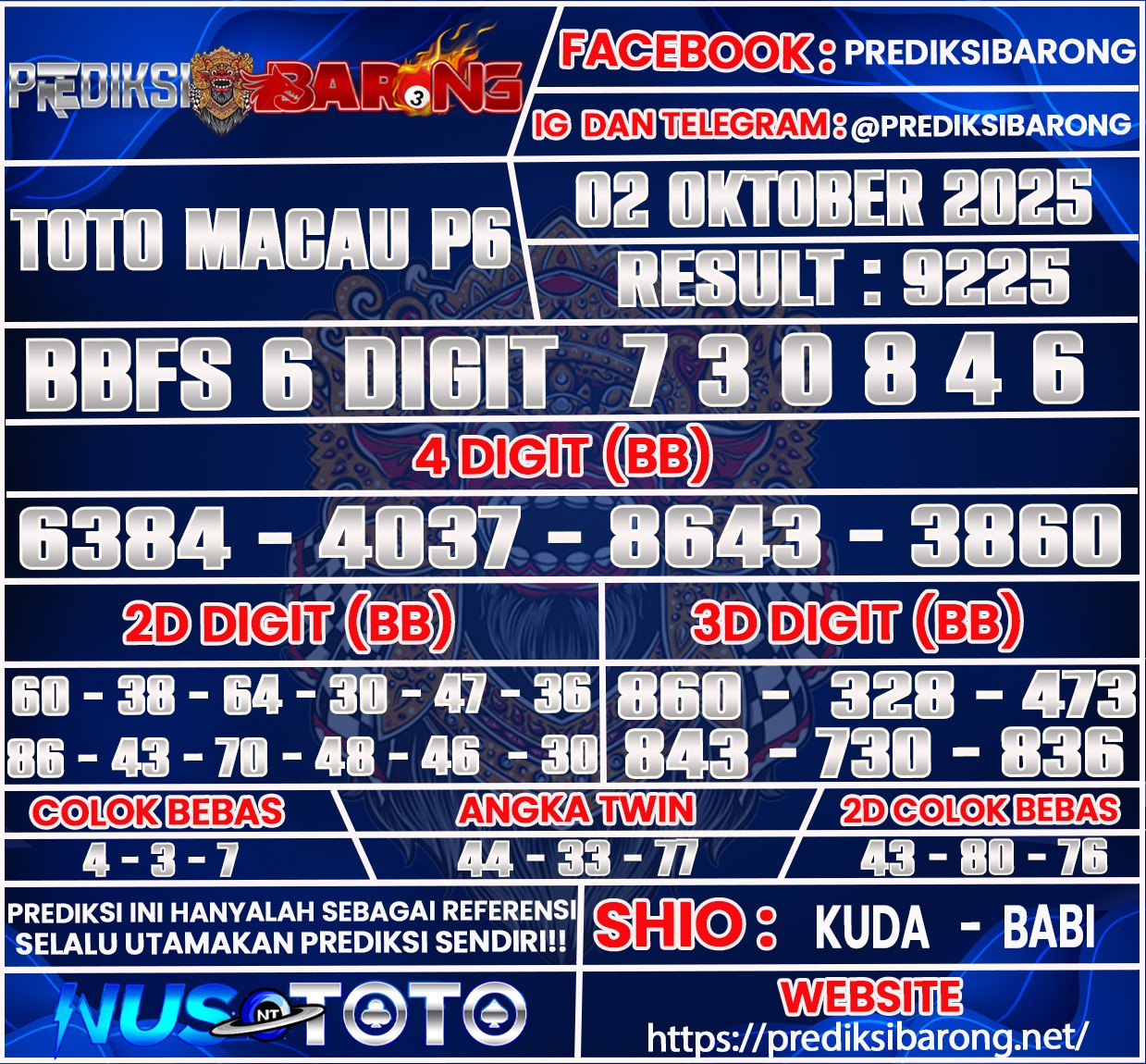 Prediksi Barong adalah layanan prediksi togel yang dirancang khusus untuk membantu para pemain togel dalam meraih keberuntungan. Pada edisi kali ini, kami menyajikan prediksi togel untuk pasar Toto Macau P6 pada hari Rabu 01 Oktober 2025. Dengan analisis mendalam dan metode yang telah teruji, kami berusaha memberikan angka-angka yang memiliki potensi tinggi untuk keluar. Prediksi ini tidak hanya berdasarkan keberuntungan semata, tetapi juga menggunakan data statistik dan pola permainan sebelumnya yang dapat memberikan wawasan lebih bagi para pemain.