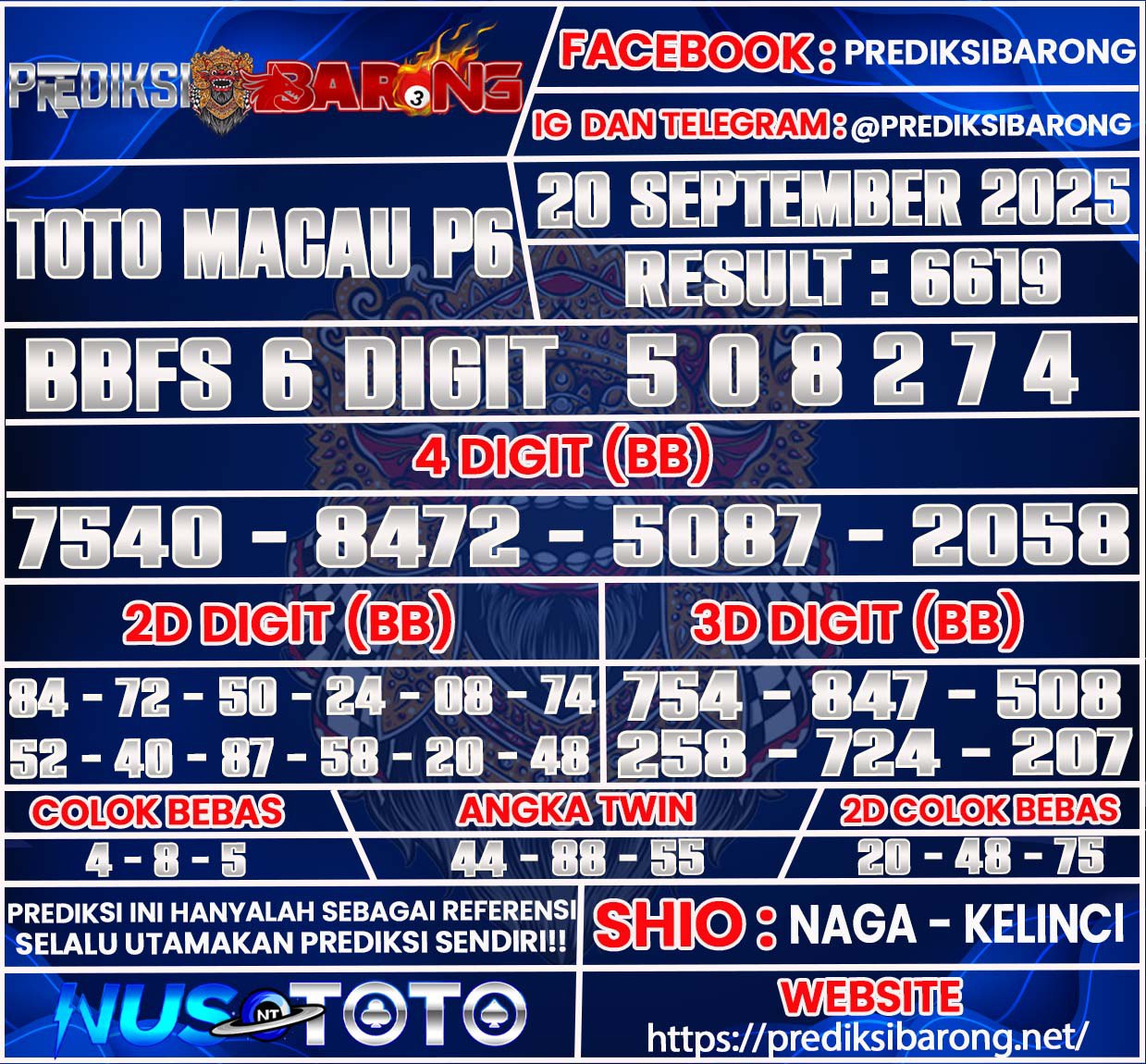 Selamat datang di Situs Prediksi Barong. Prediksi Barong merupakan situs prediksi angka togel yang berasal dari situs togel terpercaya dan teramanah yaitu NUSTOTO. Prediksi Barong sendiri sudah berdiri dari tahun 2018 hingga sekarang dan kualitasnya sudah di uji oleh para ahli paito dan pecinta togel resmi. Hari ini Prediksi Barong telah menyediakan Prediksi Toto Macau P6 baik bosku untuk kendala bosku akan kami alihkan keteam terkait kami ya bosku