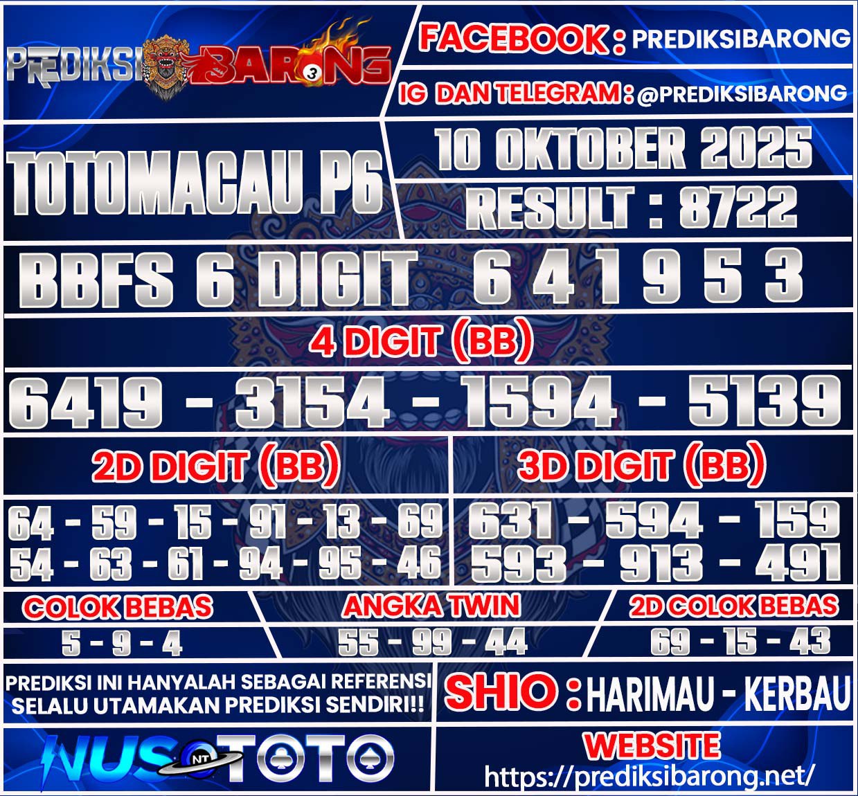 PREDIKSI TOTO MACAU P6 Jumat 10 Oktober 2025