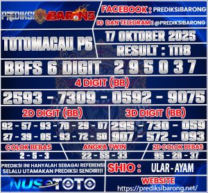 Prediksi Barong adalah layanan prediksi togel yang dirancang khusus untuk membantu para pemain togel dalam meraih keberuntungan. Pada edisi kali ini, kami menyajikan prediksi togel untuk pasar Toto Macau P6 pada hari Jumat 17 Oktober 2025. Dengan analisis mendalam dan metode yang telah teruji, kami berusaha memberikan angka-angka yang memiliki potensi tinggi untuk keluar. Prediksi ini tidak hanya berdasarkan keberuntungan semata, tetapi juga menggunakan data statistik dan pola permainan sebelumnya yang dapat memberikan wawasan lebih bagi para pemain.