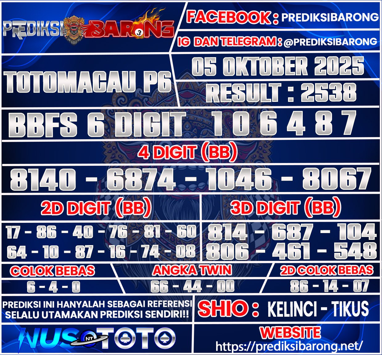 Prediksi Barong adalah layanan prediksi togel yang dirancang khusus untuk membantu para pemain togel dalam meraih keberuntungan. Pada edisi kali ini, kami menyajikan prediksi togel untuk pasar Toto Macau P6 pada hari Minggu 05Oktober 2025. Dengan analisis mendalam dan metode yang telah teruji, kami berusaha memberikan angka-angka yang memiliki potensi tinggi untuk keluar. Prediksi ini tidak hanya berdasarkan keberuntungan semata, tetapi juga menggunakan data statistik dan pola permainan sebelumnya yang dapat memberikan wawasan lebih bagi para pemain.