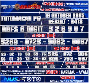 Prediksi Barong adalah layanan prediksi togel yang dirancang khusus untuk membantu para pemain togel dalam meraih keberuntungan. Pada edisi kali ini, kami menyajikan prediksi togel untuk pasar Toto Macau P6 pada hari Rabu 15 Oktober 2025. Dengan analisis mendalam dan metode yang telah teruji, kami berusaha memberikan angka-angka yang memiliki potensi tinggi untuk keluar. Prediksi ini tidak hanya berdasarkan keberuntungan semata, tetapi juga menggunakan data statistik dan pola permainan sebelumnya yang dapat memberikan wawasan lebih bagi para pemain.