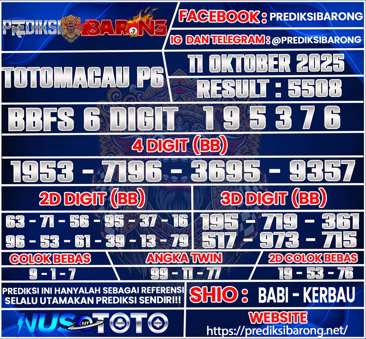 Prediksi Barong adalah layanan prediksi togel yang dirancang khusus untuk membantu para pemain togel dalam meraih keberuntungan. Pada edisi kali ini, kami menyajikan prediksi togel untuk pasar Toto Macau P6 pada hari Sabtu 11 Oktober 2025. Dengan analisis mendalam dan metode yang telah teruji, kami berusaha memberikan angka-angka yang memiliki potensi tinggi untuk keluar. Prediksi ini tidak hanya berdasarkan keberuntungan semata, tetapi juga menggunakan data statistik dan pola permainan sebelumnya yang dapat memberikan wawasan lebih bagi para pemain.