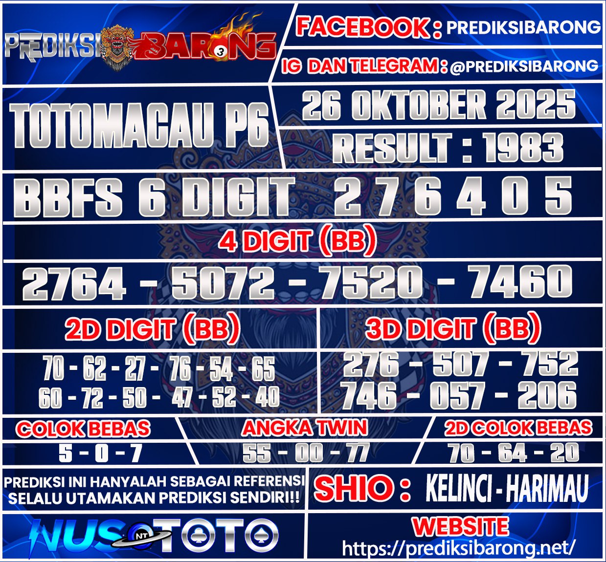 Selamat datang di Situs Prediksi Barong. Prediksi Barong merupakan situs prediksi angka togel yang berasal dari situs togel terpercaya dan teramanah yaitu NUSTOTO. Prediksi Barong sendiri sudah berdiri dari tahun 2018 hingga sekarang dan kualitasnya sudah di uji oleh para ahli paito dan pecinta togel resmi. Hari ini Prediksi Barong telah menyediakan Prediksi Toto Macau P6 baik bosku untuk kendala bosku akan kami alihkan keteam terkait kami ya bosku