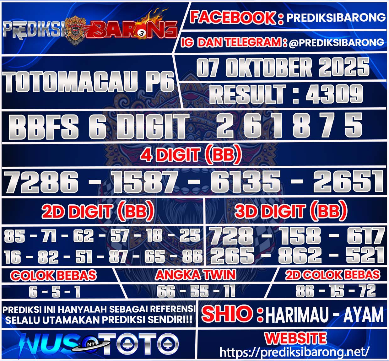 Prediksi Barong adalah layanan prediksi togel yang dirancang khusus untuk membantu para pemain togel dalam meraih keberuntungan. Pada edisi kali ini, kami menyajikan prediksi togel untuk pasar Toto Macau P6 pada hari Selasa 07 Oktober 2025. Dengan analisis mendalam dan metode yang telah teruji, kami berusaha memberikan angka-angka yang memiliki potensi tinggi untuk keluar. Prediksi ini tidak hanya berdasarkan keberuntungan semata, tetapi juga menggunakan data statistik dan pola permainan sebelumnya yang dapat memberikan wawasan lebih bagi para pemain.