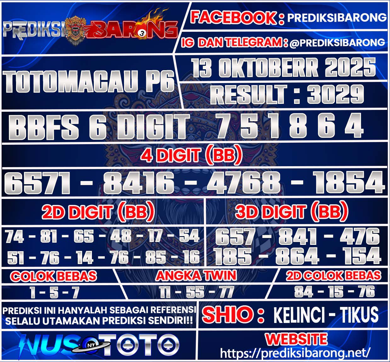 Prediksi Barong adalah layanan prediksi togel yang dirancang khusus untuk membantu para pemain togel dalam meraih keberuntungan. Pada edisi kali ini, kami menyajikan prediksi togel untuk pasar Toto Macau P6 pada hari Senin 13 Oktober 2025. Dengan analisis mendalam dan metode yang telah teruji, kami berusaha memberikan angka-angka yang memiliki potensi tinggi untuk keluar. Prediksi ini tidak hanya berdasarkan keberuntungan semata, tetapi juga menggunakan data statistik dan pola permainan sebelumnya yang dapat memberikan wawasan lebih bagi para pemain.