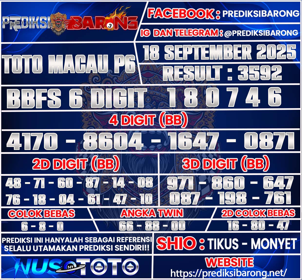Prediksi Barong adalah layanan prediksi togel yang dirancang khusus untuk membantu para pemain togel dalam meraih keberuntungan. Pada edisi kali ini, kami menyajikan prediksi togel untuk pasar Toto Macau P6 pada hariS Kamis 18 September 2025. Dengan analisis mendalam dan metode yang telah teruji, kami berusaha memberikan angka-angka yang memiliki potensi tinggi untuk keluar. Prediksi ini tidak hanya berdasarkan keberuntungan semata, tetapi juga menggunakan data statistik dan pola permainan sebelumnya yang dapat memberikan wawasan lebih bagi para pemain.