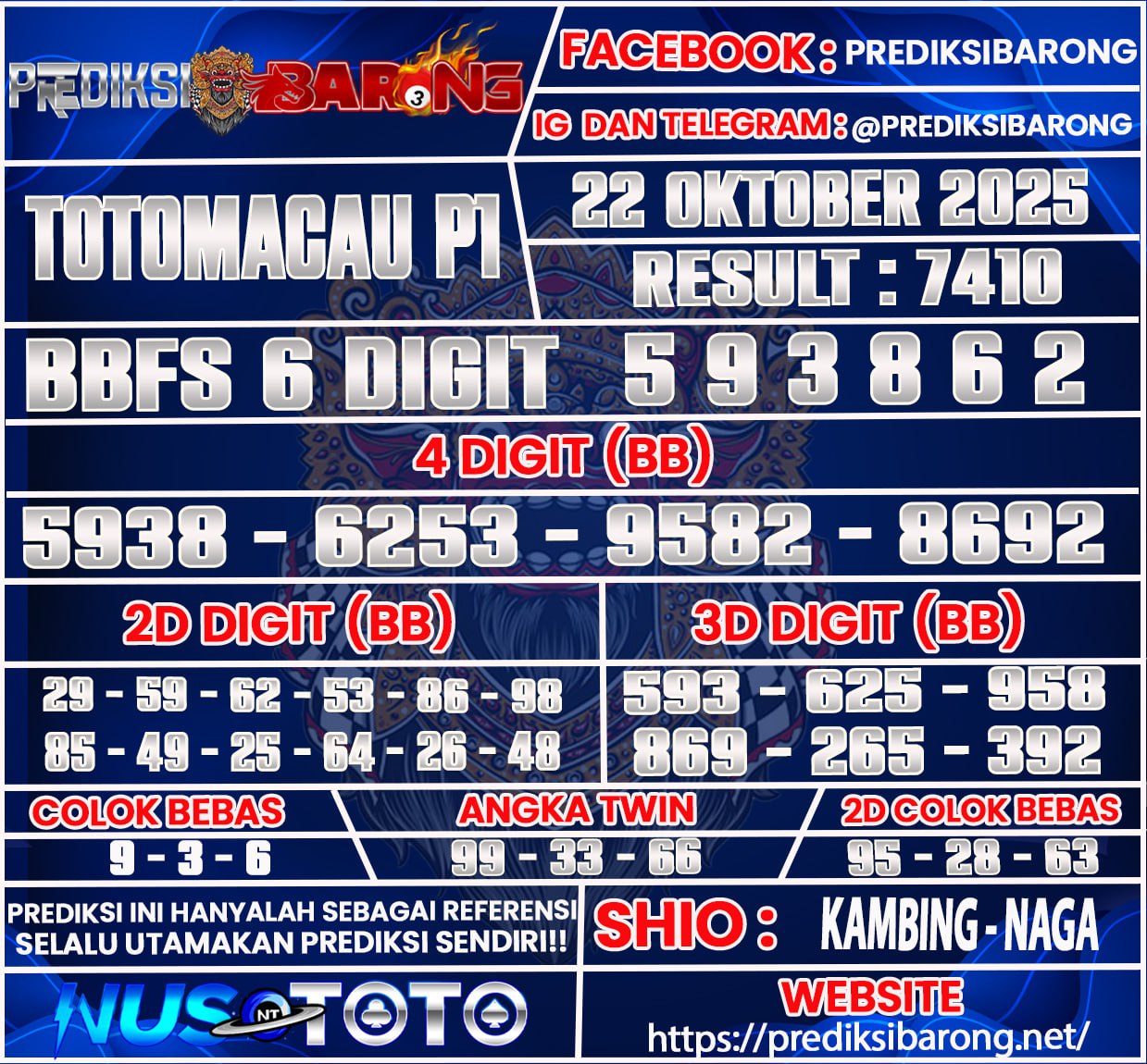 Prediksi Barong adalah layanan prediksi togel yang dirancang khusus untuk membantu para pemain togel dalam meraih keberuntungan. Pada edisi kali ini, kami menyajikan prediksi togel untuk pasar Toto Macau P1 pada hari Sabtu 18 Oktober 2025. Dengan analisis mendalam dan metode yang telah teruji, kami berusaha memberikan angka-angka yang memiliki potensi tinggi untuk keluar. Prediksi ini tidak hanya berdasarkan keberuntungan semata, tetapi juga menggunakan data statistik dan pola permainan sebelumnya yang dapat memberikan wawasan lebih bagi para pemain.