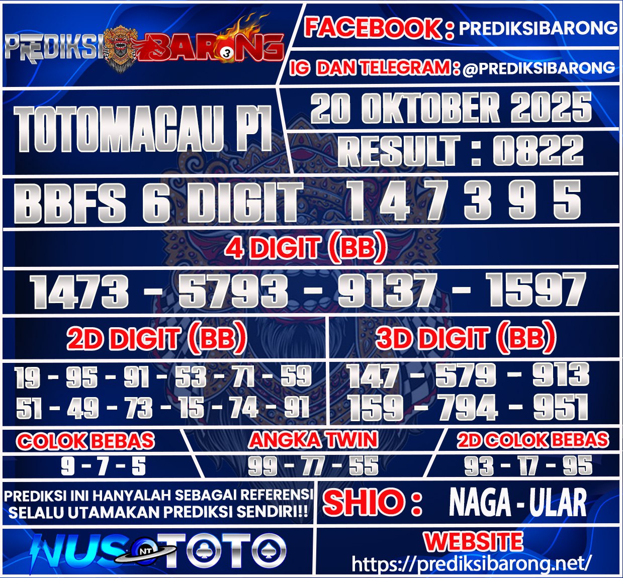 Oleh karena itu tanpa menunggu lama inilah Prediksi Toto Macau MingguSenin 20   Oktober 2025 Dari Prediksi Barong :